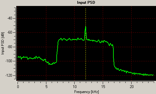 Um wieder Audio-Decodierung zu ermöglichen, muß der verstimmte Störsender-Träger um 15dB abgesenkt werden. Im Spektrum sieht man nur noch eine relativ unauffällige kleine Spitze auf der Mittenfrequenz.